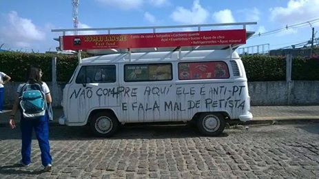 O Blog recebeu essa foto em um grupo de “Zap Zap”, segundo apuramos, essa kombi de lanches fica perto da facex, e teria sido pichada porque o dono não concorda com o estilo do PT governar, vejam o que fizeram com o meio de vida do proprietário, lamentável, que democracia é essa?